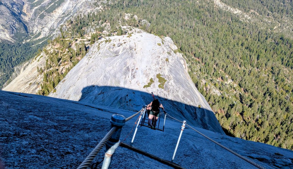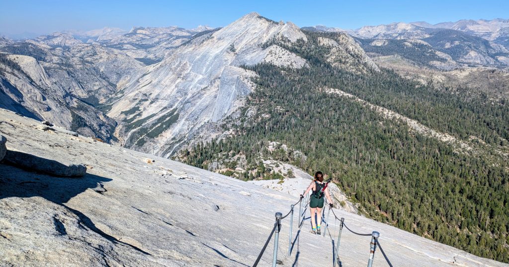 Let me pause here with some Half Dome info and thoughts. According to Google, the cables cover the last 400 vertical feet of the hike, climbing a steep granite face at an angle of around 45 degrees, with wooden steps and steel cables for handholds. This makes it a thrilling, airy ascent after a long, strenuous 14-16 mile day hike with ~4,800 feet of elevation gain. It is indeed a hard hike and yes, people have died on Half Dome. Most of these deaths were due to lightning strikes, but a few have fallen on the cables, one as recently as 2024. Over half these cases involved wet, slippery conditions.