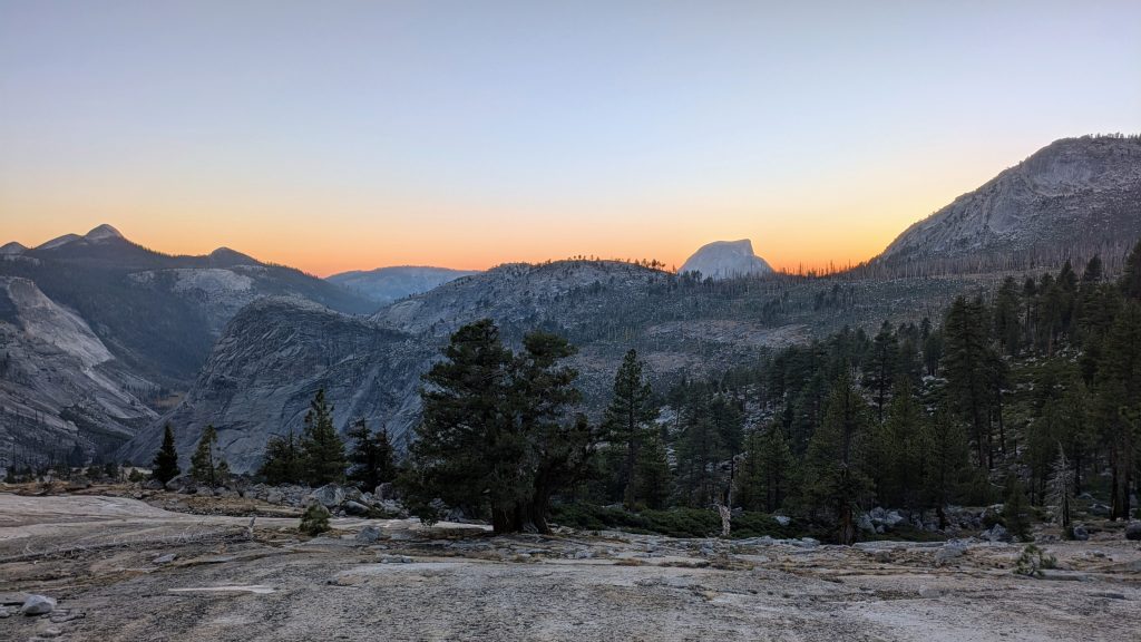 I joined the 2 Swiss guys for the remaining mile to the trail junction, which made the time pass quickly. They were really interesting to talk to. The rest of the way I was on my own, as all the day hikers went right towards Yosemite valley and all the backpackers were already settled into their camps for the night. I stopped to take a dip and filter water from a stream before the remaining dry miles through the burn. The nail in the coffin was the scratchy 2 miles through the overgrown section. My poor legs were on fire afterwards…yes I could have mitigated the damage by wearing my tights, but it was just too hot. It took longer than expected to make it back to my camp, but I only had to use my headlamp for about 30 minutes and still managed to cook dinner before I crashed. Plus the sunset views looking back towards Half Dome and then the moon rising over the white granite fields were an extra treat. What an exhausting but fun day. Now to get back to the hard stuff!